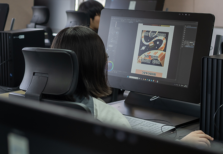최신 장비와 프로그램을 활용한 창작 환경에서 학생들은 콘텐츠 산업 현장의 흐름을 반영한 실습 중심 수업을 통해 상상력을 자유롭게 펼치며, 전문성과 창의성을 동시에 갖춘 웹툰 작가, 애니메이터, 일러스트레이터로 성장하게 됩니다.